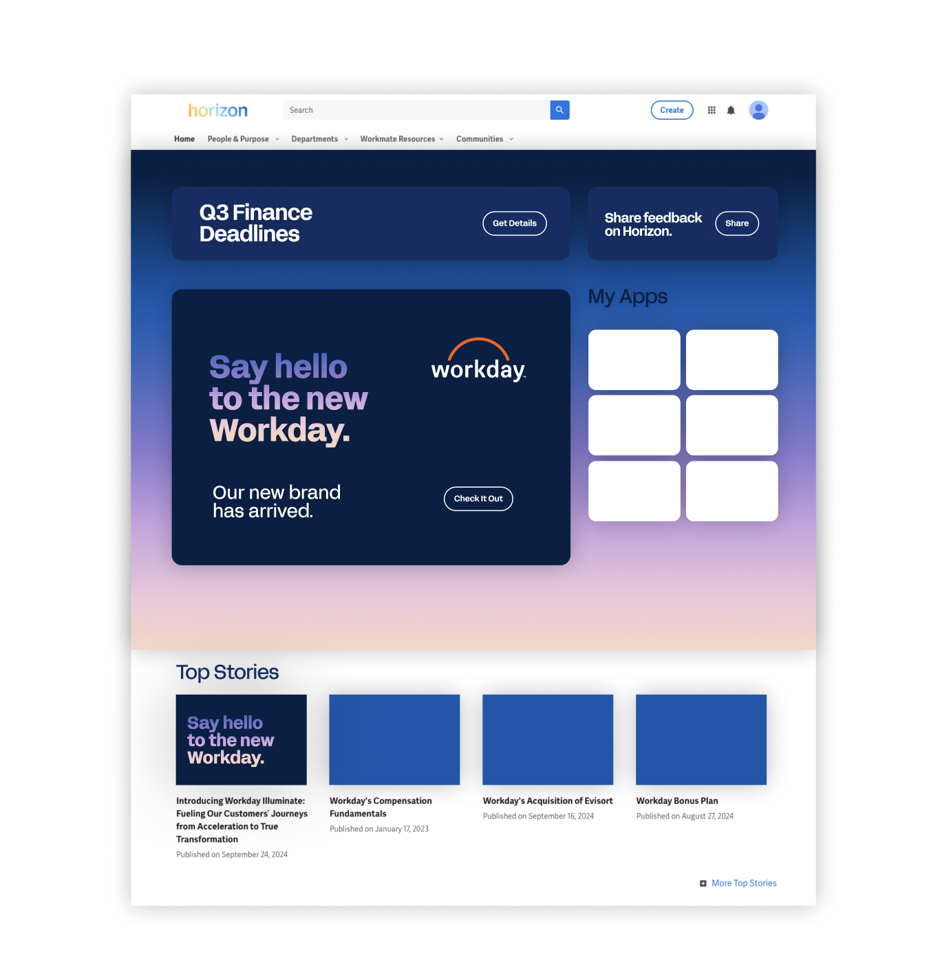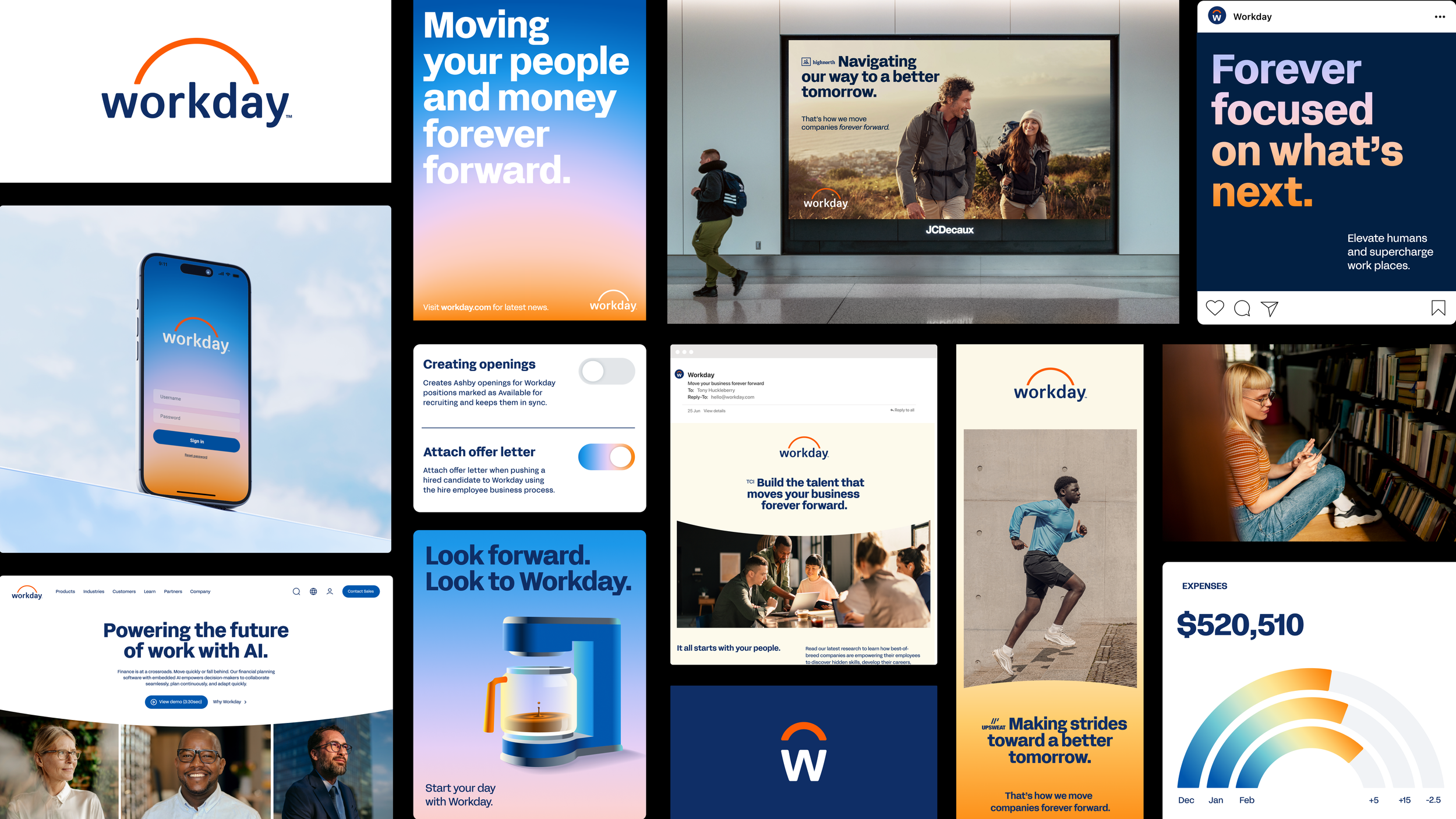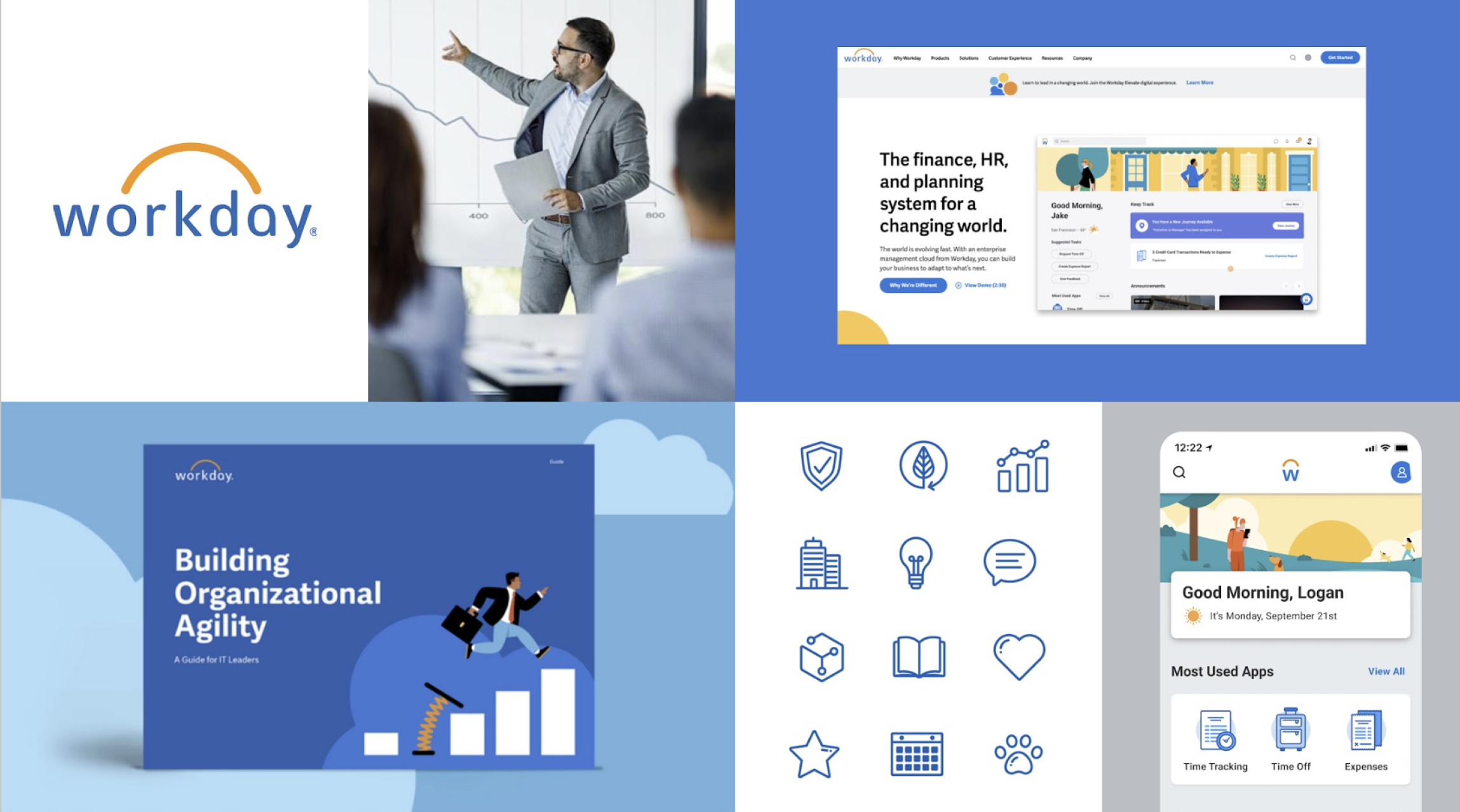 Our partners at Koto helped us develop a brand refresh that would better resonate with both employees and employers. We developed a brand theme rooted in optimism, elevating Workday’s iconic sunrise with a redrawn logo, modern typography, and a suite of playful, office-inspired icons. The expanded design system reflects the shifts of daylight—from bright mornings to welcoming evenings—positioning Workday into something approachable, relatable, and more human.